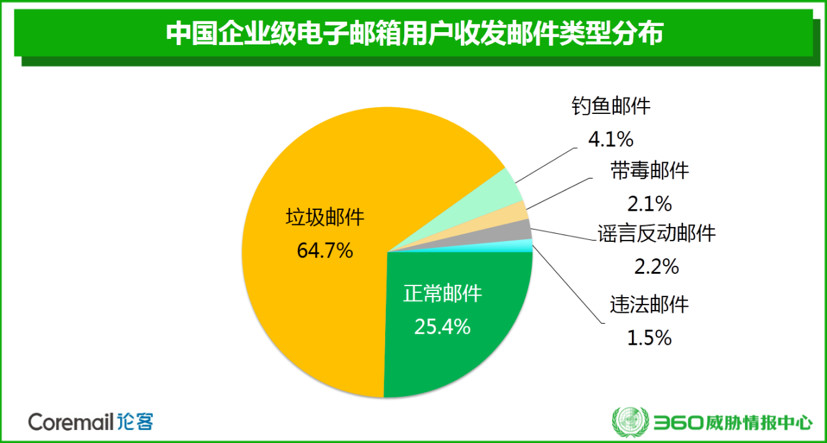 报告显示,截止2017年底,在企业级电子邮箱用户收发的邮件中,正常邮件占比约为25.4%,普通垃圾邮件占比为64.7%、钓鱼邮件4.08%、带毒邮件2.12%、谣言反动邮件2.23%,色情、赌博等违法信息推广邮件约1.47%。也就是说,2017年,在邮件系统收发的邮件中,仅有约1/4为正常邮件,垃圾邮件及其他各类非法、恶意邮件等非正常邮件的数量,是正常邮件数量的三倍左右。如图显示: