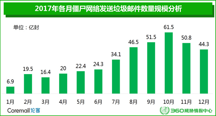 据盈世Coremail邮件系统与360威胁情报中心的联合监测,2017年下半年,僵尸网络开始被大量的应用于垃圾邮件攻击。综合统计显示,在2017盈世Coremail邮件系统截获的所有垃圾邮件中,至少有10%以上的垃圾邮件是由僵尸网络产生。