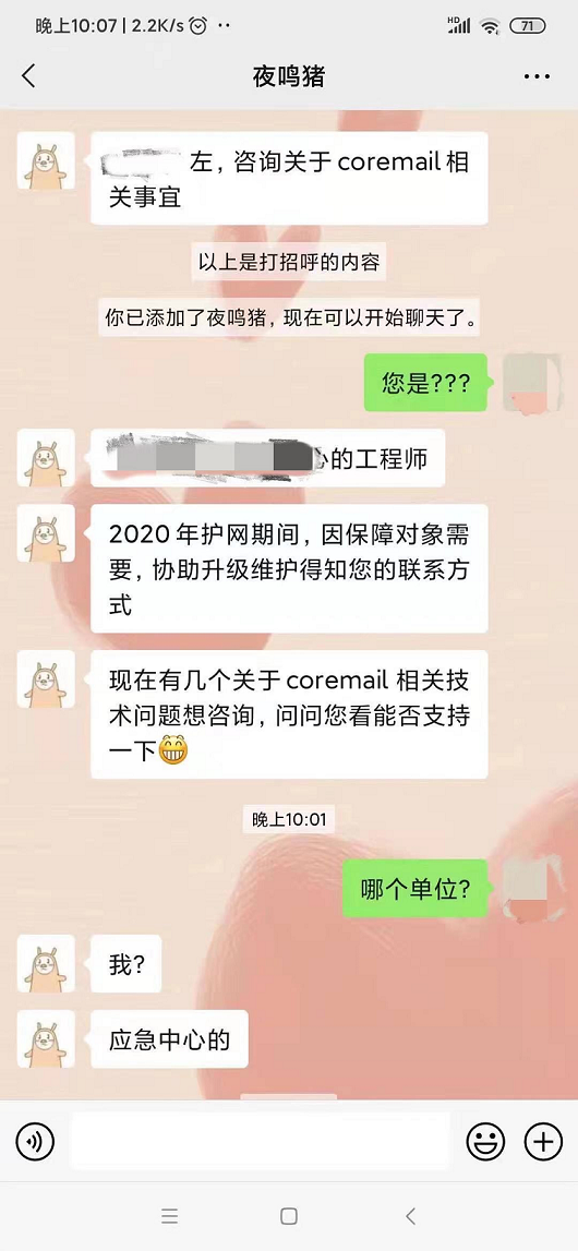 昨日深夜十点,Coremail论客企业邮箱的一位服务人员忽然收到自称是某应急中心的工程师,前来咨询“某大型网络攻防演练”期间的相关技术支持。本着“一站式解决客户所有邮件安全问题”的专业服务精神,小伙伴立即在群内反馈,想要先了解一下去年合作的具体情况,以便准备相关材料。